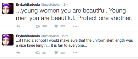Erykah Badu was inspired into a Twitter rant Monday (April 11) based off a New Zealand school making high school girls wear longer skirts. The rule was put in place so as to not “distract” male teachers and students.