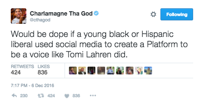 “Would be dope if a young black or Hispanic liberal used social media to create a Platform to be a voice like Tomi Lahren did,” tweeted Charlamagne.”